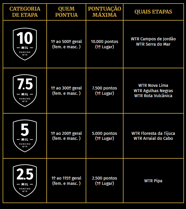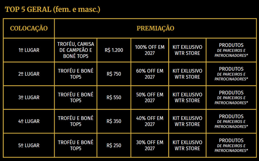 Os resultados parciais são atualizados em até 7 dias úteis após cada etapa realizada Os atletas receberão notificações por e-mail marketing no endereço cadastrado na plataforma de inscrição e poderão visualizar no site oficial a sua colocação no Ranking tanto no GERAL quanto em sua CATEGORIA. Ao final da temporada, os atletas que estiverem no TOP 5 Geral não participam do pódio da categoria. As atualizações serão divulgadas também nas redes oficiais da WTR.
