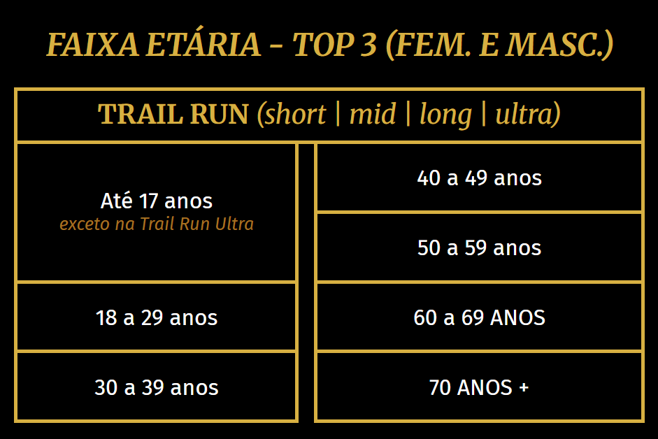 Teremos premiação para os 5 colocados gerais de cada distância e para os 3 primeiros colocados de cada categoria. No final do ano, os campeões da temporada vão receber prêmios exclusivos e o TOP 5 GERAL de cada modalidade, distância e gênero leva também premiação em dinheiro.