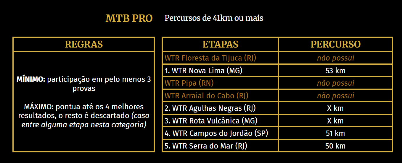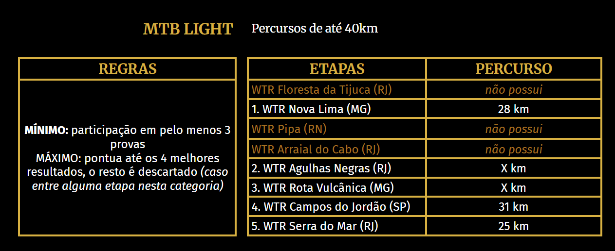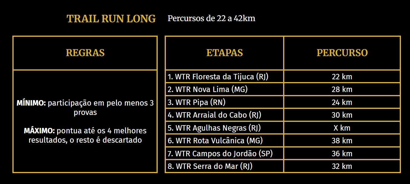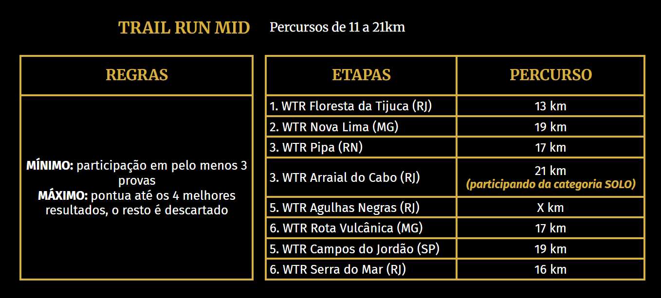 O Ranking WTR vale para as distâncias Short, Mid, Long e Ultra de Trail Run e Light e Pro do Mountain Bike. A modalidade Duathlon não está inserida no Ranking WTR. Contudo, os atletas que disputarem provas nesta modalidade ao longo do ano estarão automaticamente pontuando para as modalidades Trail Run e Mountain Bike, de acordo com as distâncias escolhidas.